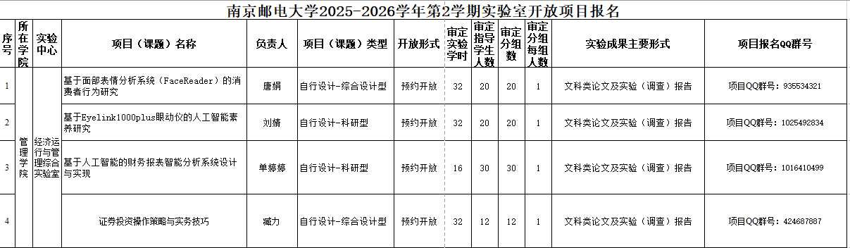 南京邮电大学2025-2026学年第二学期实验室开放项目报名通知
